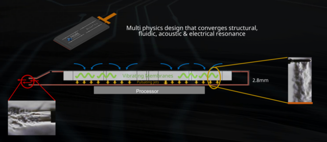 AirJet по-прежнему считается радиатором, это по сути твердотельное устройство, как и любой тип медного радиатора. Однако он имеет мембраны внутри, которые вибрируют на ультразвуковых частотах. При вибрации всасывается воздух во впускные отверстия в верхней части AirJet. Оказавшись внутри устройства, воздух затем преобразуется в “пульсирующие струи”, поскольку воздух отводит тепло от распределителя тепла. В конечном итоге он выпускается по бокам через встроенные носики. После этого производитель устройства должен найти способ полностью отводить тепло из системы.