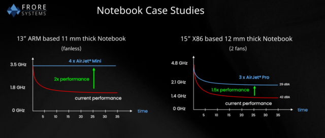 По словам генерального директора Сешу Мадхавапедди в интервью PCWorld, процессор ARM с частотой 1,8 ГГц с четырьмя AirJet Mini сможет работать на частоте 3,5 ГГц «вечно». AirJet Pro, созданный для x86, может работать на PL1 с частотой 2,1 ГГц вместо 1,4 ГГц с вентилятором. Кроме того, AirJet в 15-дюймовом ноутбуке будет производить всего 29 дБА звука вместо 42 дБА с вентилятором.