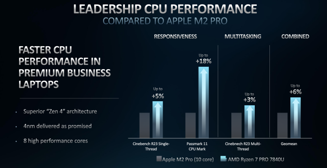 В целом, AMD утверждает, что ее флагманские мобильные процессоры Ryzen Pro обеспечивают более высокую производительность по сравнению с Intel Core i7-1370P, процессором vPro с шестью P-ядрами и восемью E-ядрами для 20 потоков. Компания утверждает, что при сравнении процессора Ryzen 7 Pro 7840U с процессором Core i7-1370P он на 12% быстрее работает в приложениях Microsoft Office, таких как Teams, при этом потребляя на 15% меньше энергии. Компания также утверждает, что у нее лучшее время автономной работы в Teams, чем у Intel и нового M2 Pro от Apple. По данным AMD, система Ryzen Pro может обеспечить 6 часов 48 минут времени Teams по сравнению с 6 часами 10 минутами для компьютера Apple. Ноутбук с процессором Core i7 показал только 4 часа в тестах AMD.