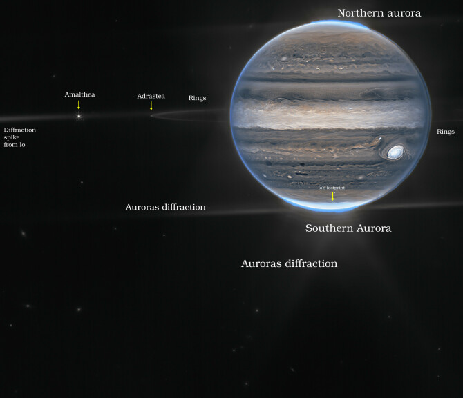 Знаете ли вы, что у Юпитера есть кольца? Они не такие заметные, как у Сатурна, но мощная гравитация Юпитера притянула достаточно материала, чтобы у него появилось несколько своих колец. Большинство телескопов не могут разглядеть блеклые кольца планеты, но Уэбб может. Летом 2022 года ученые сфотографировали Юпитер с помощью "Уэбба" и запечатлели кольца, а также светящиеся полярные сияния на обоих полюсах.