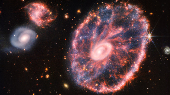 В начале своей работы "Уэбб" взглянул на один самых популярных объектов среди астрономов - галактику "Колесо телеги". В далеком прошлом эта галактика пережила столкновение с другой галактикой, оставив ей характерную колесообразную форму. "Уэбб" обнаружил более плавное расположение старых звезд в ядре по сравнению с молодыми звездами в расширяющемся кольце галактики.