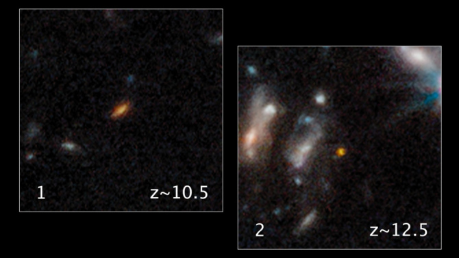 Мы уже обсудили "Первое глубокое поле Уэбба", но на этом изображении скрываются некоторые особенные объекты, которые заслуживают внимания. Две из множества галактик, видимых на этом кадре, привлекли внимание исследователей из Гарвард-Смитсоновского центра. Было обнаружено, что галактики (выше) имеют экстремальные красные смещения 10,5 и 12,5, что означает, что они выглядят такими, какими они были всего через 450 миллионов и 350 миллионов лет после Большого взрыва. Это делает их одними из самых далеких и, следовательно, самых старых галактик, когда-либо виденных.