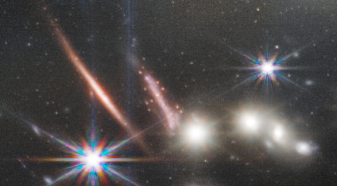 Вы думали, что мы закончили изучать "Первое глубокое поле Уэбба"? Ещё нет, потому что там сотни необычных галактик. Там скрывается еще один удивительный объект, который астрономы назвали «Бенгальский огонь». Как и все на изображении, Бенгальский огонь выглядит таким, каким он был в далеком прошлом. Эта галактика молодая и не очень большая, но она усеяна шаровыми скоплениями, имеющими много общего со скоплениями, все еще присутствующими в Млечном Пути. Ученые предполагают, что Бенгальский огонь может быть очень похож на Млечный Путь в зачаточном состоянии.
