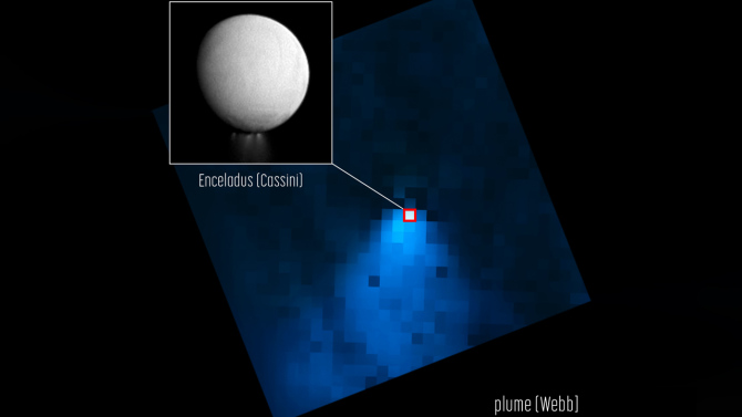 Спутник Сатурна Энцелад представляет большой интерес для планетологов благодаря выдающимся шлейфам воды, которые извергаются с его поверхности. Это явное свидетельство наличия подповерхностного океана сделало Энцелад возможной целью будущих космических миссий. "Уэбб" недавно сфотографировал Энцелад, и хотя он не смог рассмотреть детали самого крошечного спутника Сатурна, ему удалось увидеть шлейф воды, извергающийся с его поверхности на расстоянии 9650 км.