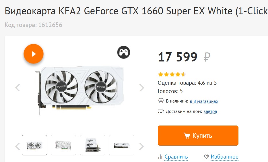 Видеокарта - тут тонкий момент, прямо дипломатический. Возьмешь подешевле - будет слабовата, менять через год. Возьмешь подороже - бюджет на смарку, не уложился. А ведь нам еще и белая нужна! Короче, между трех огней! В итоге, после метаний и противоречий берем в ДНС, KFA2 1660 Super White. Всё-таки сборка бюджетная, для нее это будет отлично. 2060 такие же идут от 23 тысяч уже, 1660ti от 20. С другой стороны, можно было такую без super взять за 15, но это была бы как раз та самая неоправданная экономия.