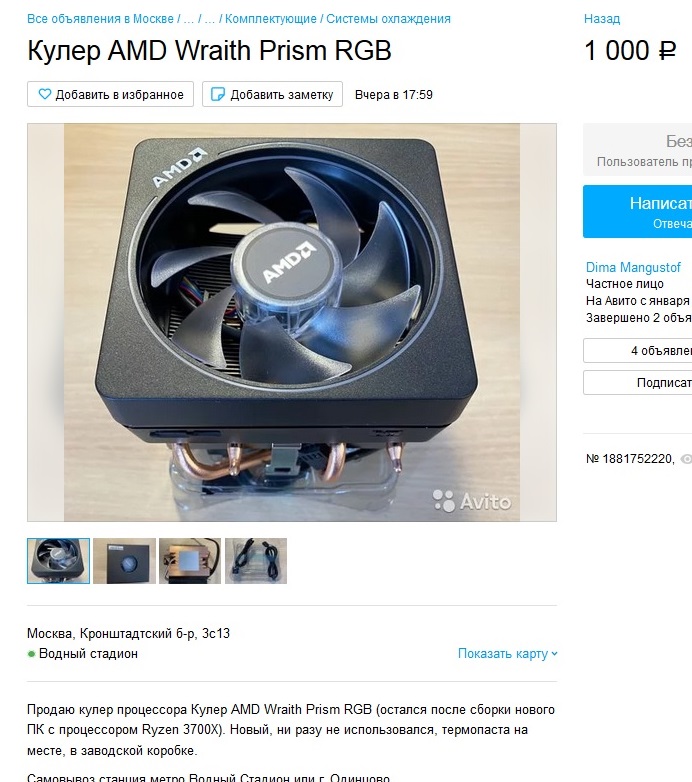 Кулер CPU. Специально этот пункт расположен в конце. Для чего? А для того, чтобы купить нестандартным методом, на Авито. Будем брать не что-нибудь, а боксовый кулер от мощнейших райзенов, Wraith Prism. Это как раз тот случай, когда на авито легче встретить хорошее, чем плохое. В основном его продают люди, купившие какой-нибудь 3700x и водянку. А бокс-кулер теперь не нужен. В общем, тут важно смотреть внимательно и при дневном свете. Выставляют его кто во что горазд, но рабочая цена за него 1000 рублей. Можно было купить башню, но минимально нормальная башня в белом цвете стоит от 2700 рублей. А Призм мы поставим на белую подсветку!