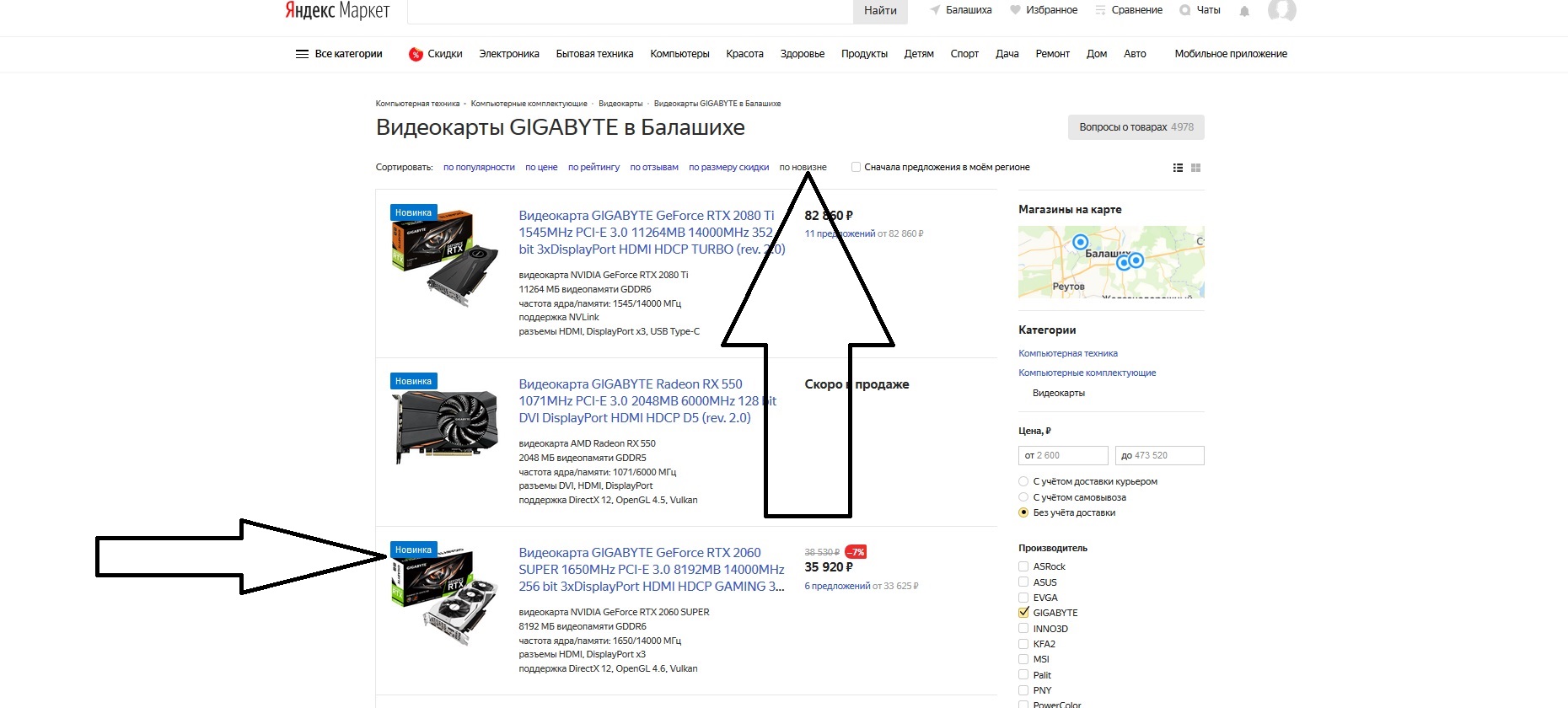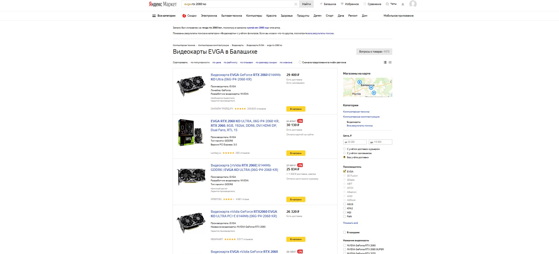 Первый пример, мы хотим приобрести пресловутую видеокарту EVGA RTX 2060 KO. Совершаем логичные действия, в соответствии с регламентом сервиса – выбираем производителя в разделе видеокарт. Что мы видим: