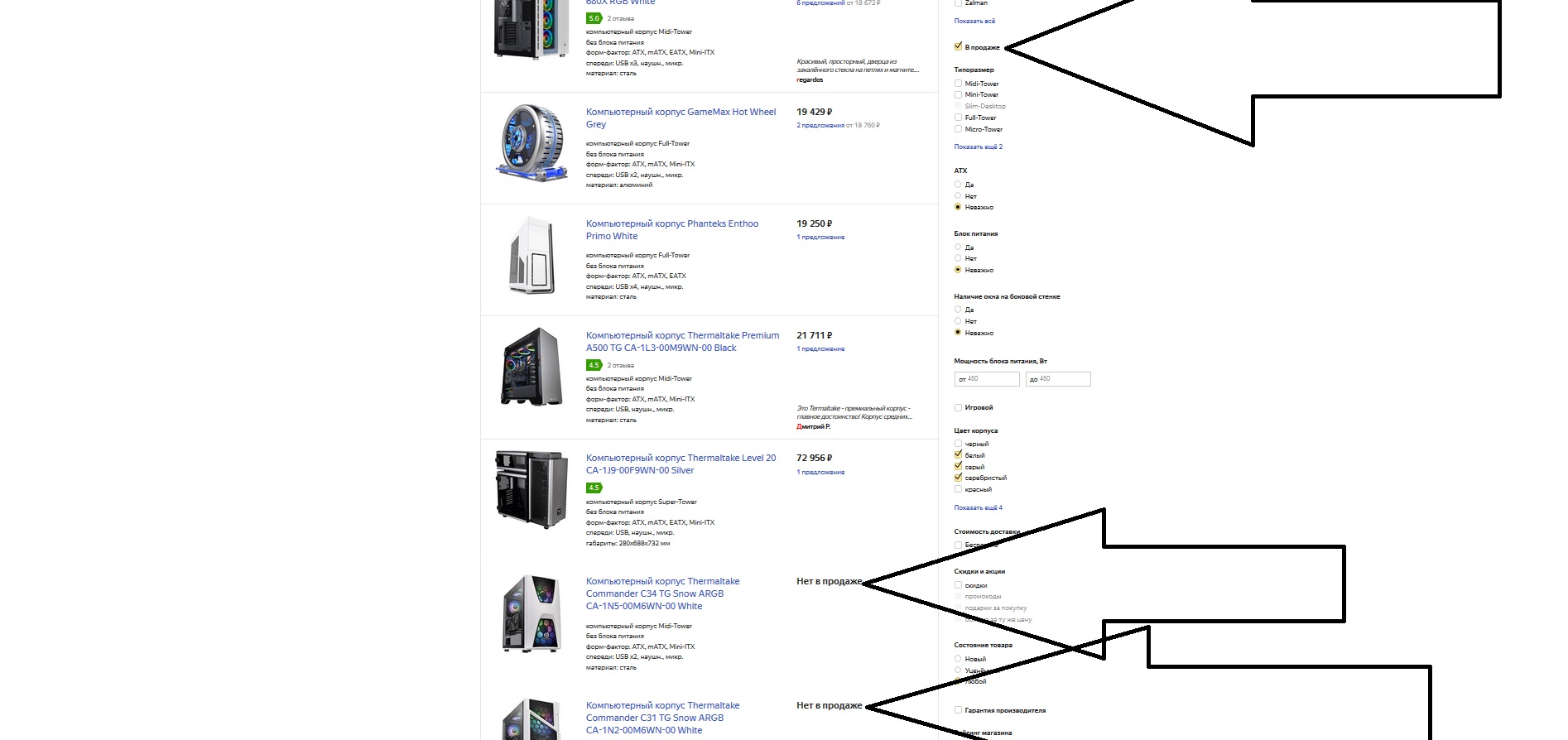 Следующее «динамо». Мы привыкли доверяться фильтрам поиска, если уж они есть. Выбираем компьютерные корпуса, которые точно есть в продаже. Поэтому, своими собственными руками ставим галочку в графе «в продаже». И что мы видим в выдаче: