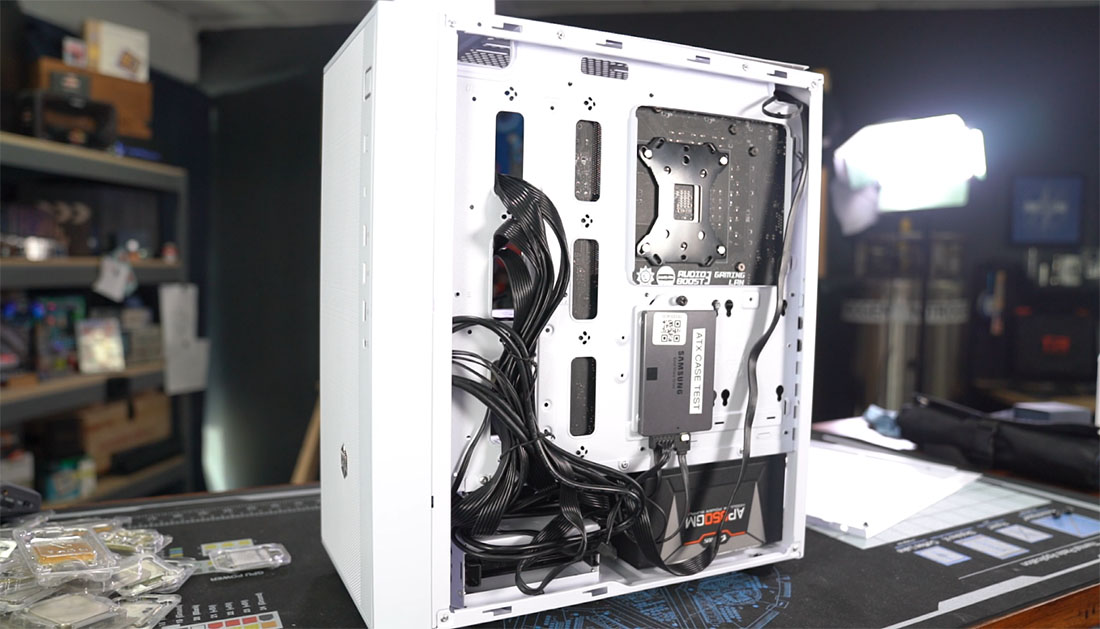 Бюджет есть бюджет, нам понравилось еще одно бюджетное решение Сильверстоун. Вместо того чтобы выдавливать петли для стяжек, они просто просверливают четыре отверстия и затем вдавливают их единым углублением, через которое легко продеть стяжки по разным направлениям. Сэкономив на липучках, мы всё равно получаем достаточно аккуратный кабель-менеджмент.