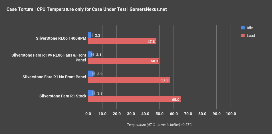 Стресс-тест Firestrike Extreme подтвердил результаты предыдущего теста GPU. Тестируемый корпус в стоковой конфигурации оказался внизу и в списке процессорных температур. Даже без нагрузки на процессор горячий воздух накапливается в верхней части корпуса и не может быть эффективно выпущен одним вентилятором.