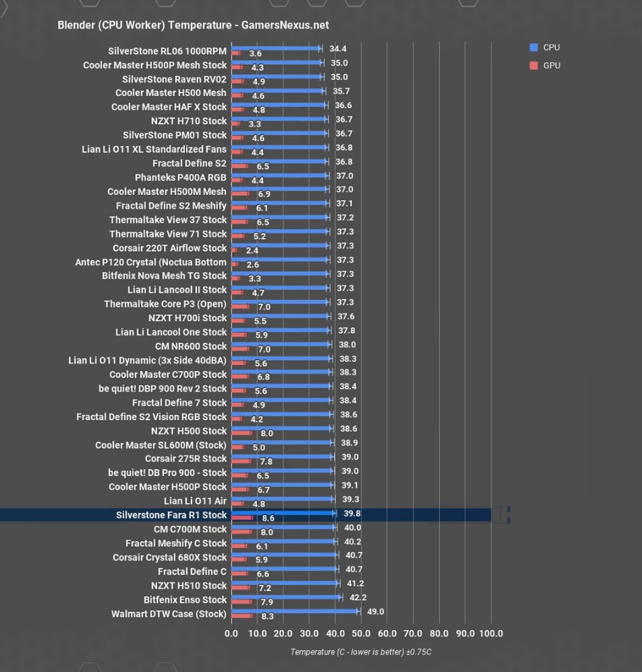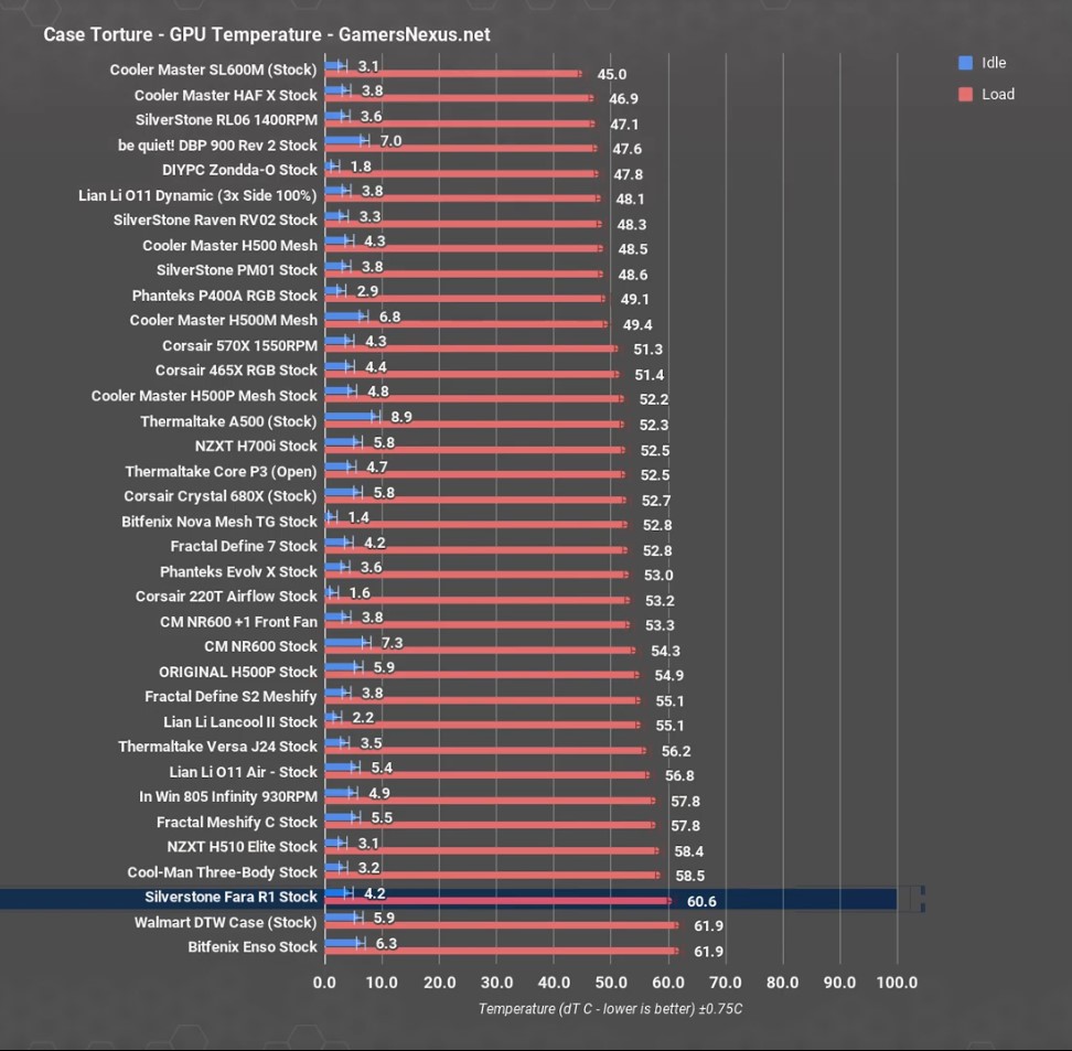 В общем сравнении корпусов, стоковый вариант Fara R1 – один из наиболее худших из всех корпусов вообще, с точки зрения температуры видеокарты. Стоковый же RL06 в среднем показал 47,1 градуса - это один из лучших результатов на рынке, который мы когда-либо видели.