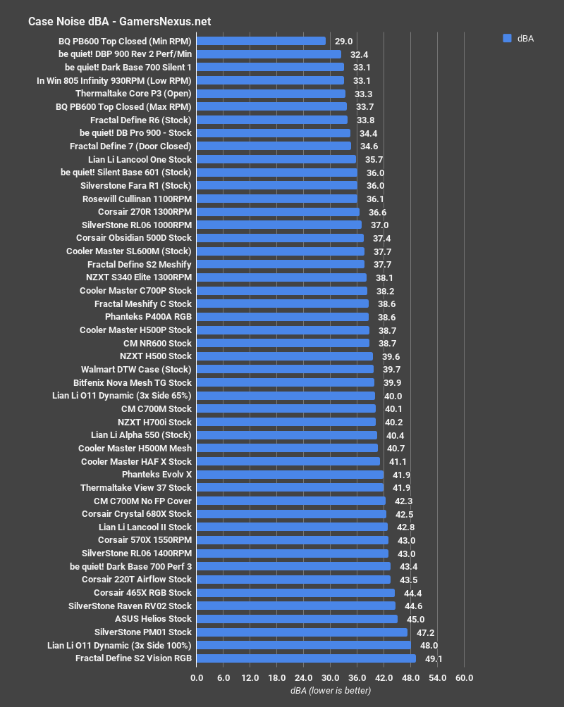 Шум от одного не самого быстрого вентилятора в задней части корпуса не может быть очень большим, поэтому показатели на уровне лидеров рейтинга тихих корпусов не должны вводить в заблуждение.