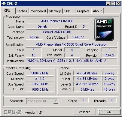 Далее обращаем внимание на процессор. Ядро Deneb, которое лежит в основе этого процессора, то его разгонный потенциал должен лежать в районе 3,8-3,9ГГц при напряжении 1,45-1,5В. Но с нашим процессором мы имеем особый случай. Т.к. он не Black Edition, коэффициент у него фиксирован на отметке 11х. Чтобы достигнуть частот 3,7ГГц нужно выставить шину в 330-340Мгц, что само по себе очень не мало для данной архитектуры. И поначалу она не особо бралась. Личный рекорд на очень-очень холодной воде 384Мгц. Но сегодня мы гоняем бенчмарки, а на такой частоте, возможен лишь скриншот. Поизмывавшись над памятью, встроенным северником и напряжением на них, удалось достигнуть частоты 3685Мгц(335Мгц по шине) на напряжении 1,44В, на котором проходили тесты.