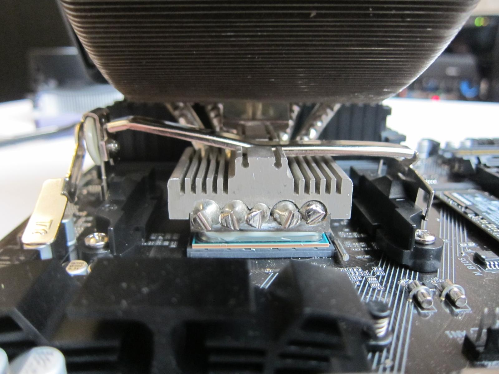 И тут при установке кулера G-Power II Pro меня ждал неприятный сюрприз - штатная скоба кулера никак не хотела надеваться на ушки крепежа АМ4 (а никто и не обещал :) ). Покопавшись в барахле, нашел пару скоб от Thermaltake из которых "соорудил" подходящую скобу. На фото ниже видно, как отличается изгиб скоб (не слишком хорошо, но как есть: снизу клипса кулера Gigabyte и она более плоская).