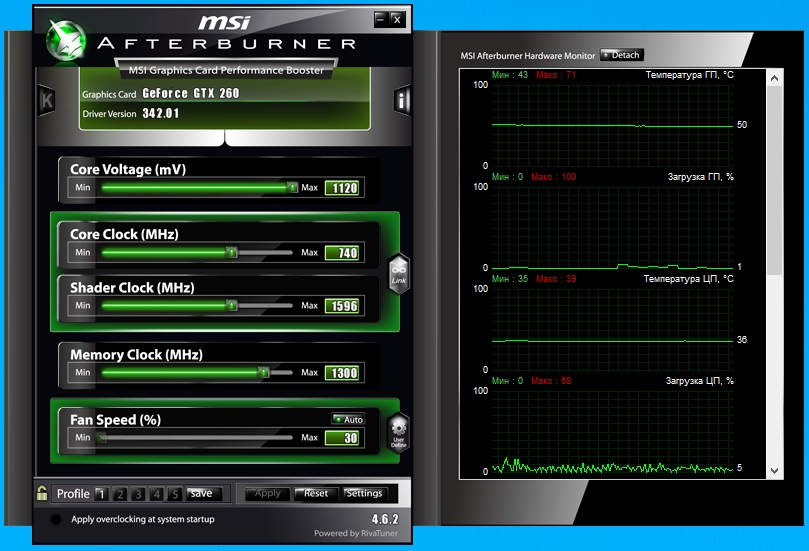 Разгон видеокарты производился при помощи MSI Afterburner, стабильность разгона проверялась программой FurMark.