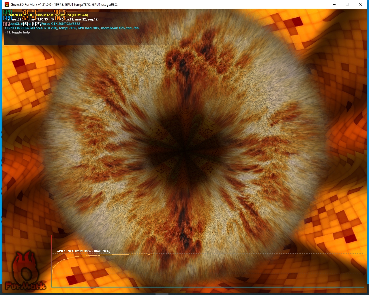 Давайте переместимся в FurMark, чтобы проверить стабильность разгона и предварительно вычислить, сколько производительности в пересчете на FPS нам удалось выжать.