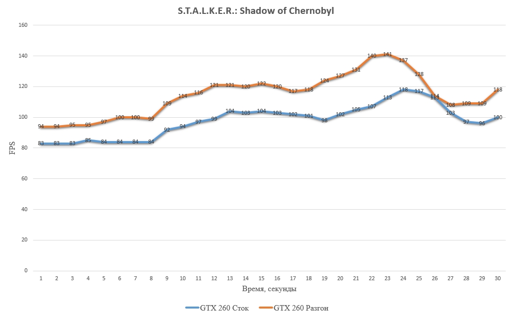 Температура возросла на 3 градуса, а FPS также увеличился на 3, что в пересчете в проценты будет равно 18.75%. Результат неплохой, потенциал разгона с вольтмодом просто отличный. А теперь давайте же переместимся в игрушки того года, чтобы проверить, какую прибавку в FPS нам бы удалось получить в то время.
