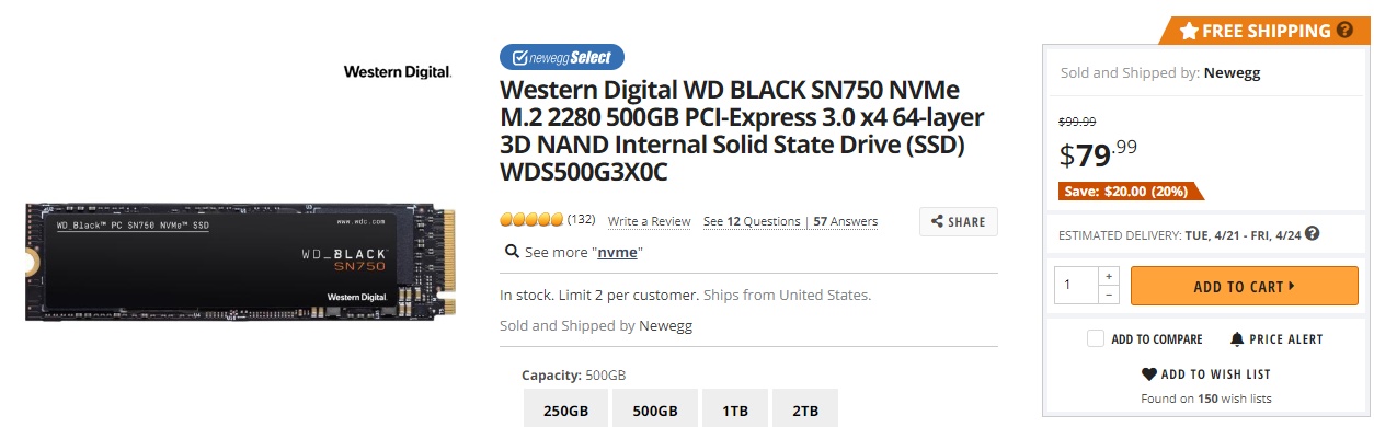 И вот один из иностранных сайтов предлагает отличные накопители Western Digital WD BLACK SN750 NVMe M.2 2280 по весьма адекватным и демократичным ценам. Самый "вкусный" NVMe накопитель, конечно, уже раскупили, ведь цена его была снижена на целых 45$. Но у вас все еще есть возможность обзавестись M.2 накопителем объемом в 500 Gb по столь же привлекательной цене.
