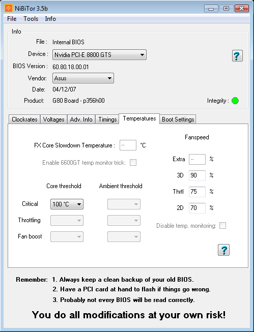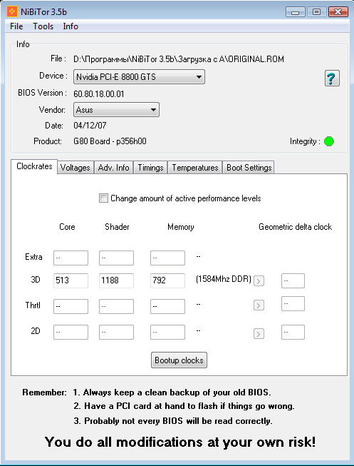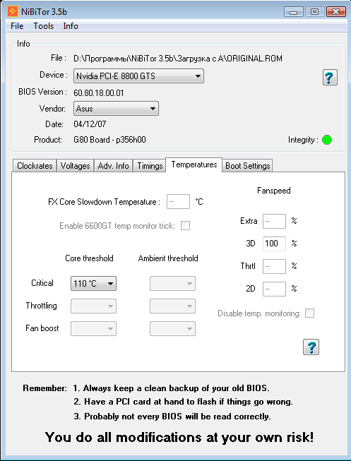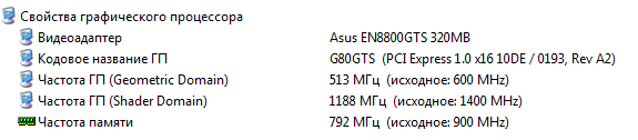 <br/><br/>Но как-то вдруг в мои руки попала замечательная карта своего времени 8800GTS на старом добром чипе G80 ревизии A2. Конкретная модель содержит следующие буковки и циферки: ASUS EN8800GTS 320Mb/320bit. Как известно, это горячий чип, требующий хорошего охлаждения. И стандартный разгон из-под драйвера карты не всегда удобен для карты без разделения частот. Дефолтные частоты карты можно увидеть в частности в известном редакторе BIOS для ГП от nVidia: