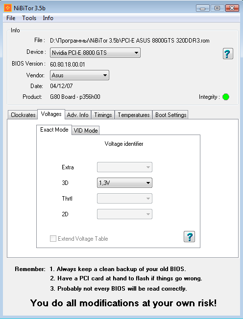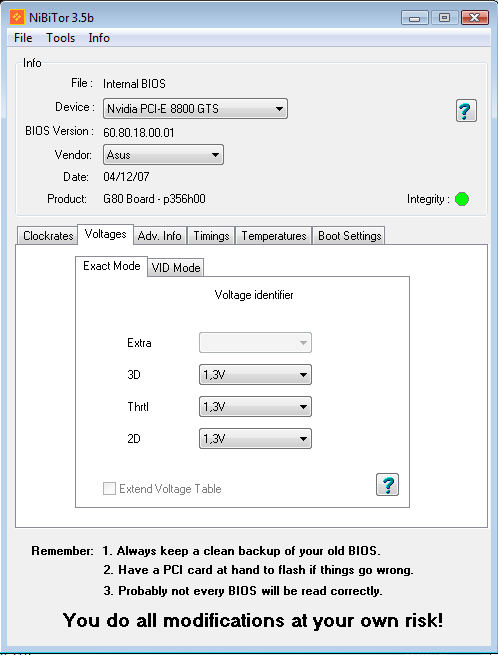 Но как-то вдруг в мои руки попала замечательная карта своего времени 8800GTS на старом добром чипе G80 ревизии A2. Конкретная модель содержит следующие буковки и циферки: ASUS EN8800GTS 320Mb/320bit. Как известно, это горячий чип, требующий хорошего охлаждения. И стандартный разгон из-под драйвера карты не всегда удобен для карты без разделения частот. Дефолтные частоты карты можно увидеть в частности в известном редакторе BIOS для ГП от nVidia: