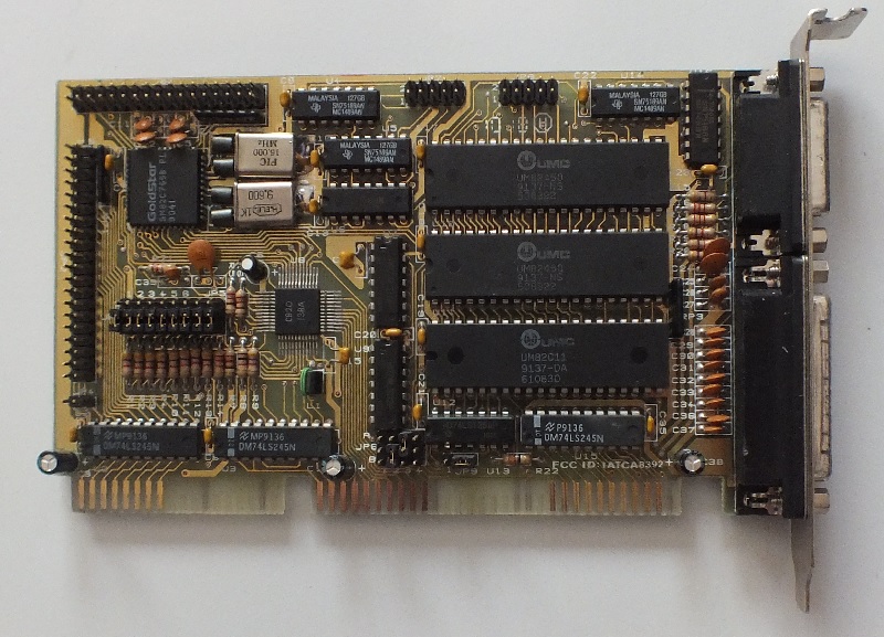 Как, надеюсь видно на фотографии, мультикарта основана на чипах UMC, позволяет подключить два FDD привода, два HDD, имеет «гребенки» для подключения двух COM-портов, с внешней стороны выведены порты LPT и джойстика. FCC ID мультикарты – IATCA8392.