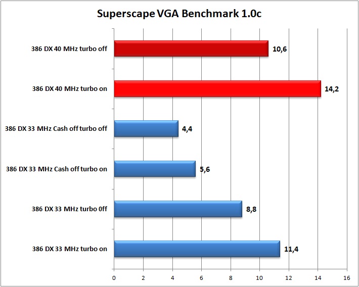 Итак, первое, что бросается в глаза – это то, что на тактовой частоте в 40 МГц процессор с отключенной кнопкой Turbo работает также, как на тактовой частоте 33 МГц с включенной кнопокой Turbo. Иными словами – эффект от разгона едва ли не линейный.