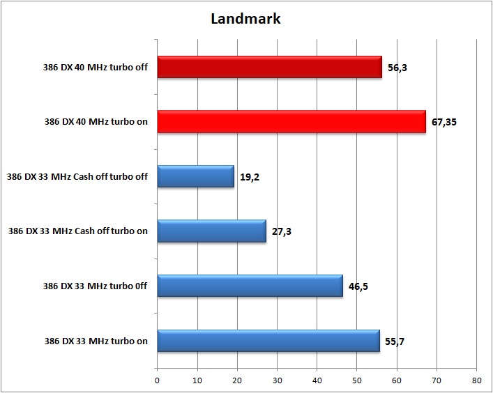 Перейдем к результатам второго теста – LANDMARK, показывающего производительность ПК относительно i80286. Смотрим на результаты: