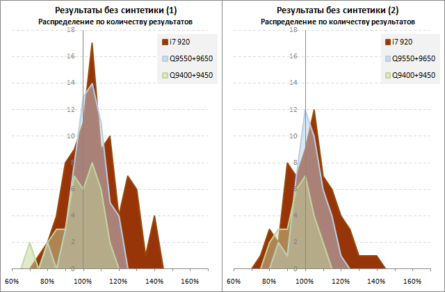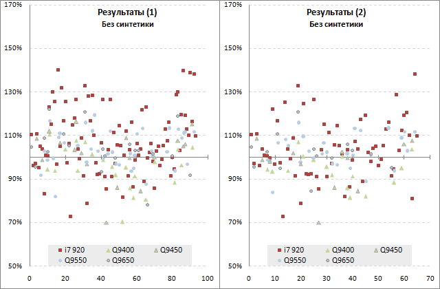Глядя на статьи, сформировавшие основную группу результатов (расположенных около 1) можно отметить, что системы с Phenom выступают чуточку быстрей при усложнении настроек графики, когда результат главным образом зависит от видеокарты.