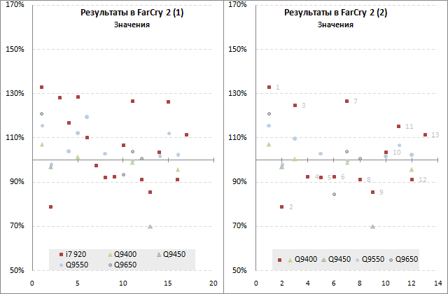 В игре FarCry 2 картина не изменилась, а стала более ярко выраженной. Мы видим одну группу результатов , разбросанных около 1.15-1.25 и плотную группу около 0.91.