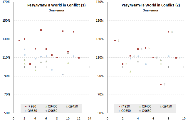 Ну что ж, World in Conflict почти не преподносит нам сюрпризов, в отличие от предшественника. Самые высокие значения, полученные в 800х600 исчезли, становится видна картина реальных отношений двух соперников в условиях нынешнего дня- тут i7 выигрывает 10-20%. Отметим аномальные результаты amdzone (1), pcworld.fr (7) и sweclockers (8). Поискать объяснение тут, как и везде, можно обратившись к конкретным результатам на этих сайтах.