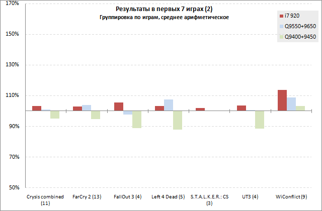Система с Phenom в среднем оказывается чуть медленней i7 в каждой игре - однако будем учитывать - эта общая оценка не может нам указывать на то, что один процессор будет быстрее другого в каком-то частном случае; это мы видели выше. i7-920 в среднем чуть быстрее, ни больше и ни меньше, и где-то i7 может оказываться медленней на эти же несколько процентов.