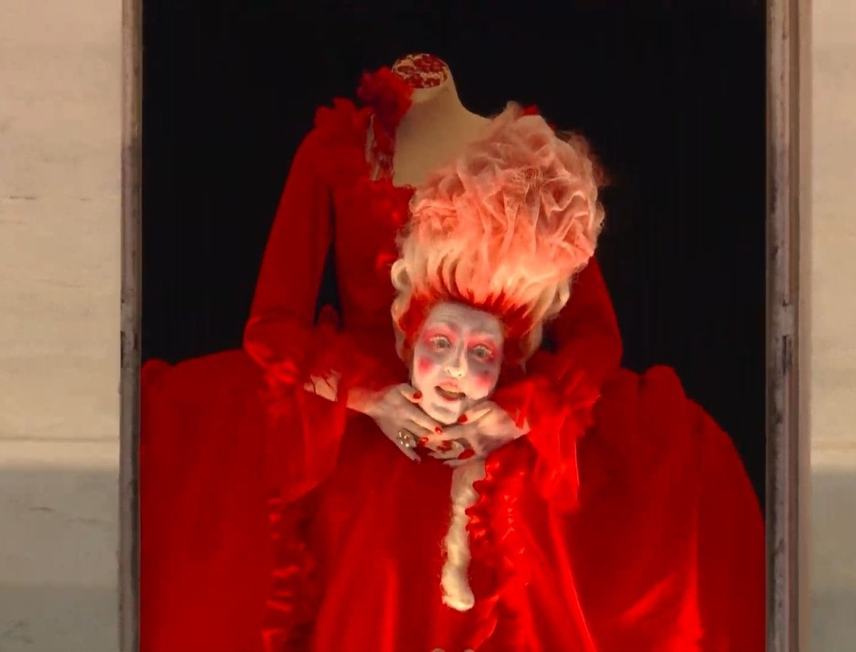 В то время как факелоносец с дуршлагом на голове погрузился во времена Великой Французской революции, напоминая о баррикадах, юных гаврошах и свободе, на экране неожиданно возникла королева Мария-Антуанетта с отрубленной головой в руках. Она появилась в окне бывшей тюрьмы Консьержери.