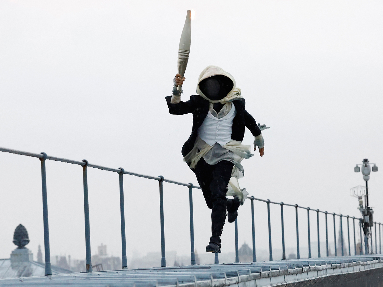 Тем временем, толпы зрителей собрались на побережье Сены. Открытие Игр было вверено загадочному мужчине в черном костюме и белой жилетке, с куском материи на голове и черным дуршлагом, который закрывал его лицо. Этот смельчак буквально носился с факелом в руках, напоминающим артиллерийский снаряд, перемещаясь между локациями, как будто это была его единственная цель.