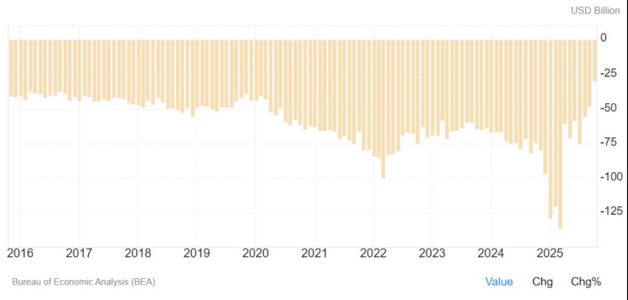 А в реальной экономике картинка получается очень любопытная, даже парадоксальная. Помните тот самый «импортозамещающий» курс, о котором много говорили при первом сроке Трампа, похоже, он начал работать, но пока в одну сторону. Торговый баланс США в октябре сжался до 29,4 миллиарда — такого дефицита страна не видела аж с 2009 года. Проще говоря, американцы стали гораздо меньше покупать зарубежных товаров.