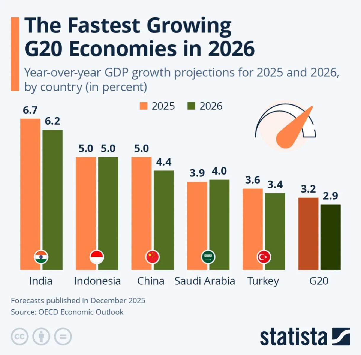 Посмотрим на прогнозы по экономическому росту на 2026 год - с одной стороны, настоящие спринтеры: Индия (+6,2%), Индонезия (+5%), Китай (+4,4%). Цифры впечатляют, но опытные экономисты смотрят на них с опаской. За такими темпами часто следует перегрев: инфляция взлетает, на рынках надуваются пузыри, а кредиты раздаются слишком легко. Управлять таким ростом — всё равно что вести спортивный болид на предельной скорости: одно неверное движение, и вместо рекорда — авария.