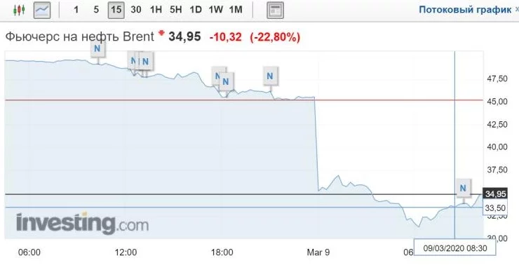 Большое потрясения ждало людей которые вкладывали все свои сбережения в нефть, считая ее одной из самых экономически стабильных акций на фондовом рынке. Обвал цены на целых 31% произошел сразу после открытия рынка 9 марта и цена стала равна 31.43$ за баррель, хотя при закрытии торгов 6 марта цена равнялась 45.27$ / баррель.