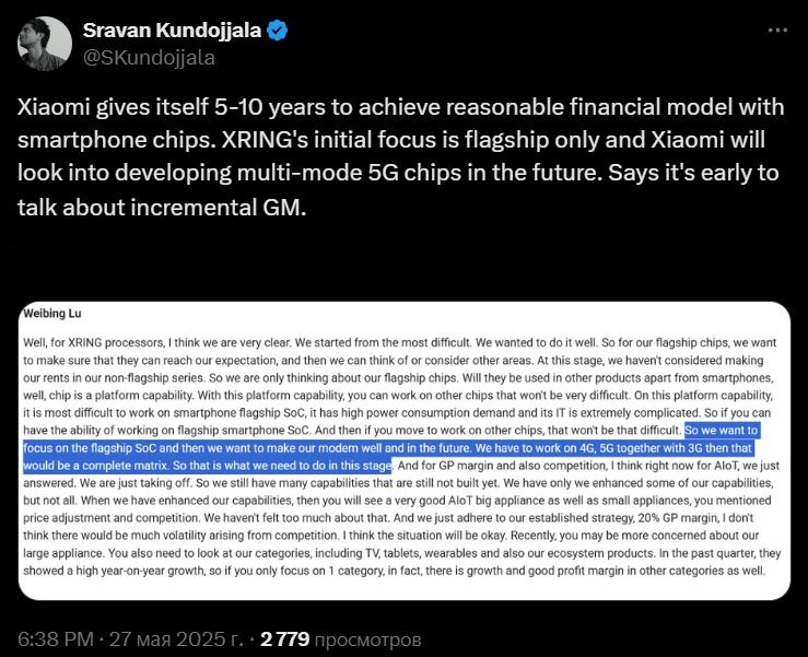 Лу Вайбинг, партнер компании, сообщил, что разработка кастомного модема 5G находится на начальной стадии, и может потребоваться время для реализации этих планов. Xiaomi также рассматривает возможность использования существующих технологий, таких как XRING 01, в более доступных моделях, что позволит снизить затраты.
