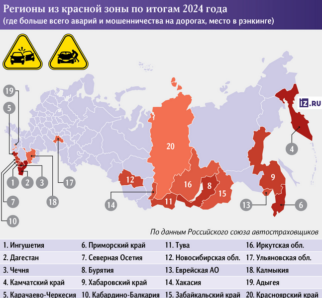 По данным Российского союза автостраховщиков, особенно остро ситуация стоит на Северном Кавказе и в ряде восточных регионов. В список наиболее убыточных территорий по итогам 2024 года вошли Чечня, Дагестан, Ингушетия, Камчатка, Карачаево-Черкесия и ещё несколько субъектов. При этом территориальные коэффициенты там занижены и не соответствуют реальным рискам.