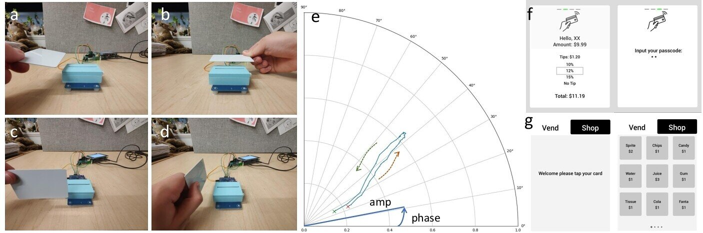 NFCGest исследует жесты, связанные с удержанием карты, выполняемые на коммерческом NFC-терминале. Предлагаемый набор из девяти жестов включает в себя (a, b) 4 направления считывания, горизонтальные и (c, d) вертикальные движения; эти жесты вызывают характерные изменения радиосигналов NFC, как показано на амплитудно-фазовой диаграмме (e). NFCGest может использоваться для бесконтактного взаимодействия в таких системах, как (f) платёжные терминалы и (g) торговые автоматы.