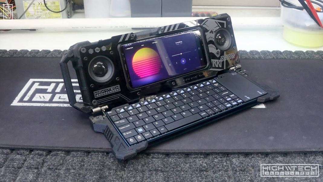В корпусе моддер разместил два стереодинамика мощностью 5 Вт каждый. Они подключены к отдельному Bluetooth-усилителю, что дает более громкий и чистый звук, чем динамик, встроенный в телефон. Для ввода текста используют компактную механическую клавиатуру со встроенным тачпадом — это позволяет работать, не касаясь экрана телефона.