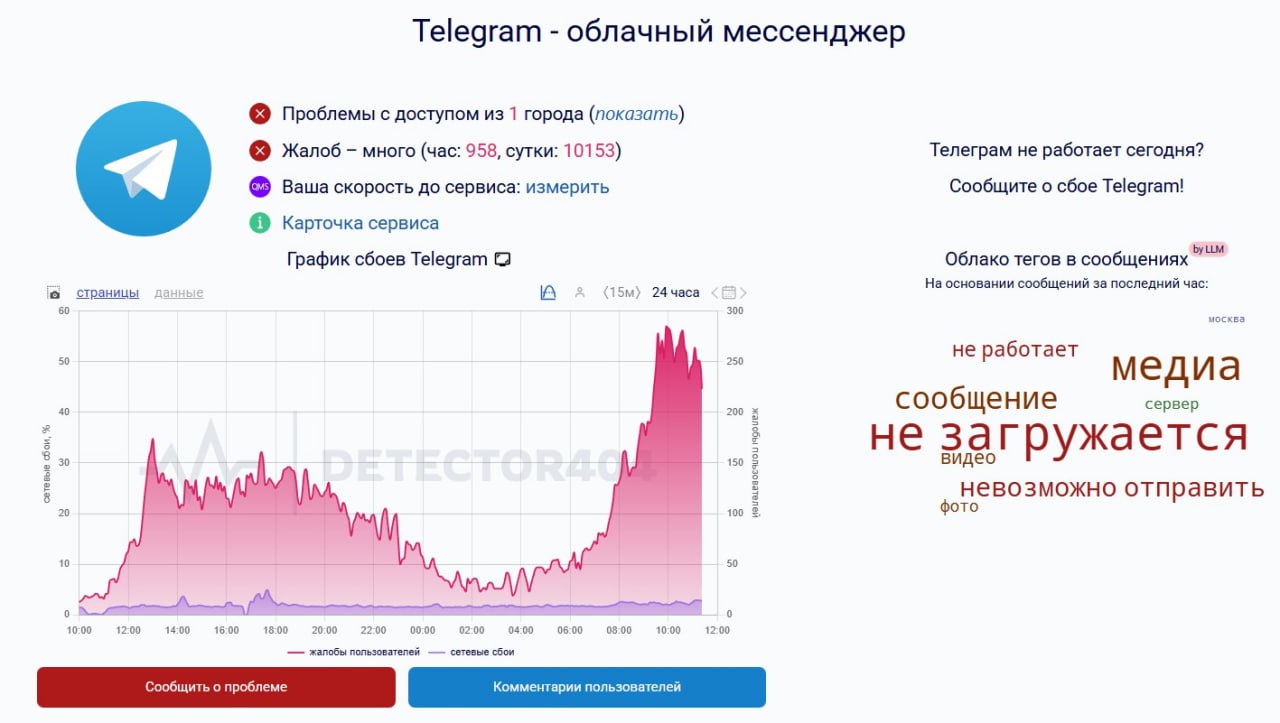Согласно статистике сервиса Downdetector, за последние сутки число обращений по поводу неполадок в Telegram превысило 11 тысяч. Фактически, ухудшение доступности сервиса предшествовало официальным данным о начале целенаправленного замедления.