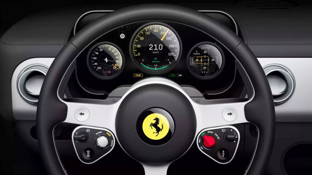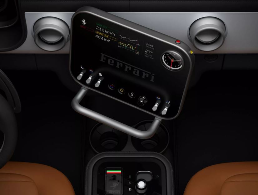 Сенсорные экраны в Ferrari остались. Приборная панель имитирует классические циферблаты с помощью OLED-дисплеев Samsung. В центре консоли стоит вертикальный тач-экран. Но базовые функции — двигатель, климат, музыка — выведены на физику. Даже стрелка на приборке сделана из анодированного алюминия и подсвечена светодиодами.