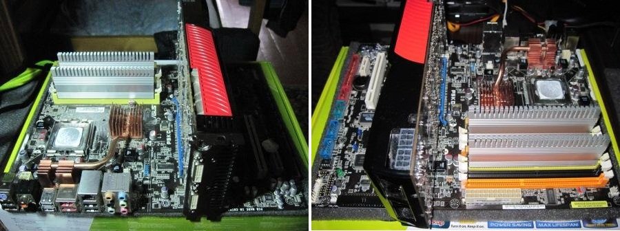 Система охлаждения выглядит более солидной , по сравнению с другими мат .платами , а именно : состоит она из двух небольших радиаторов на северном мосте и двух каналах стабилизатора питания, и одной объединяющей тепловой трубки