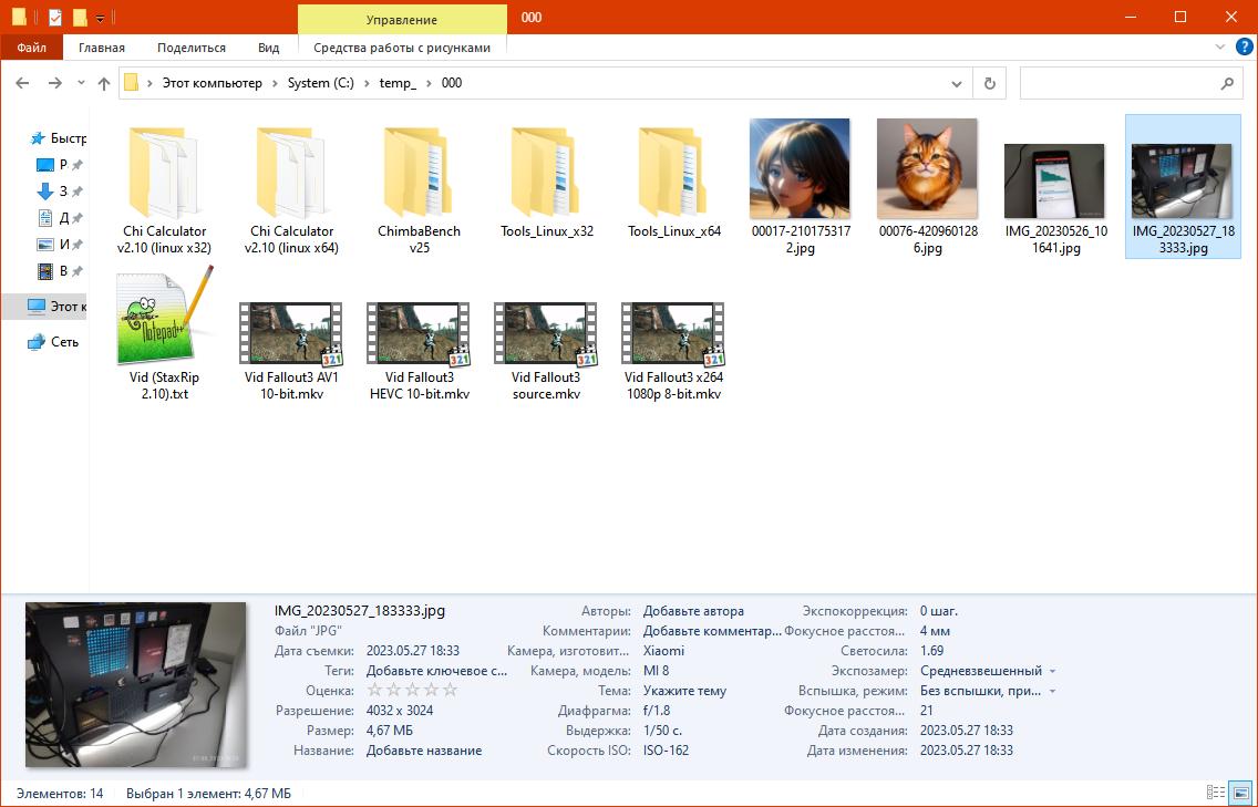 Потом несколько фотографий с кучей свойств, например модель камеры, диафрагма, выдержка, ISO, режим работы вспышки и т.п., эти фотографии помогут определить адекватность работы панели подробной информации о выделенном файле, если такая панель конечно вообще есть: