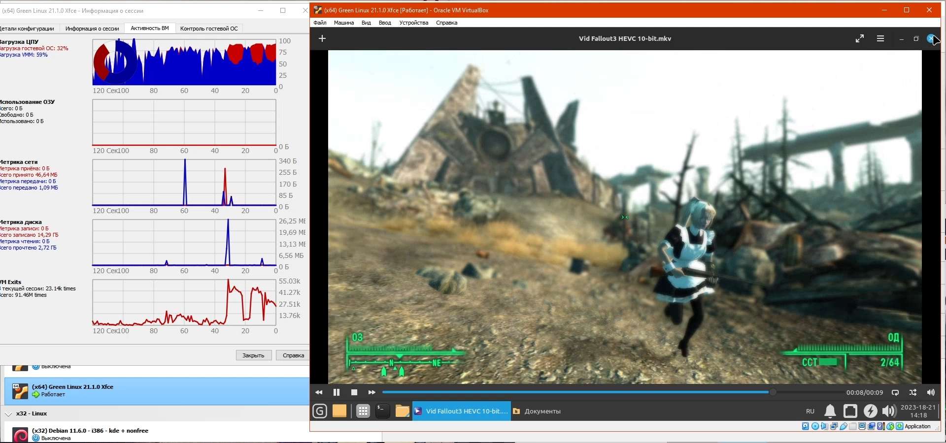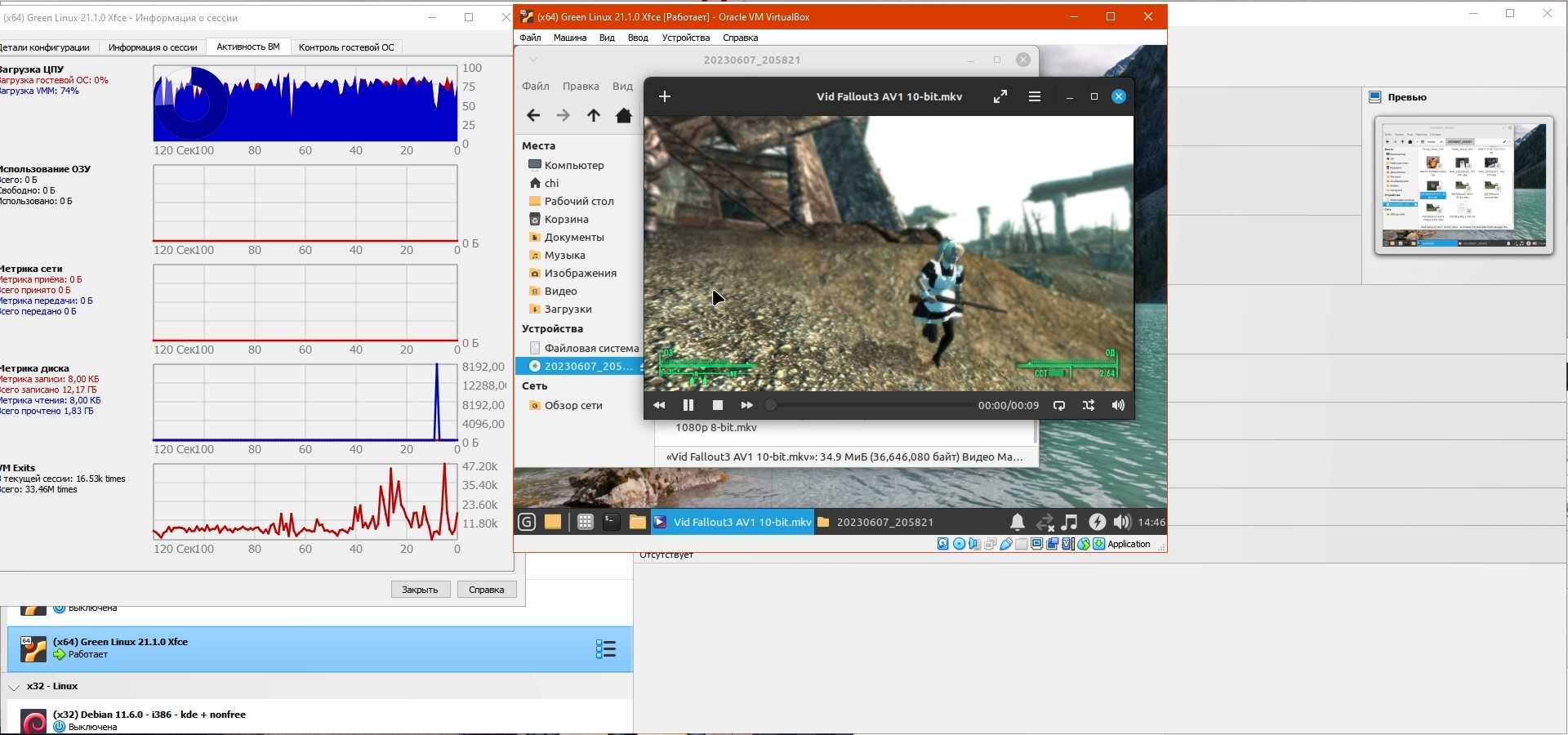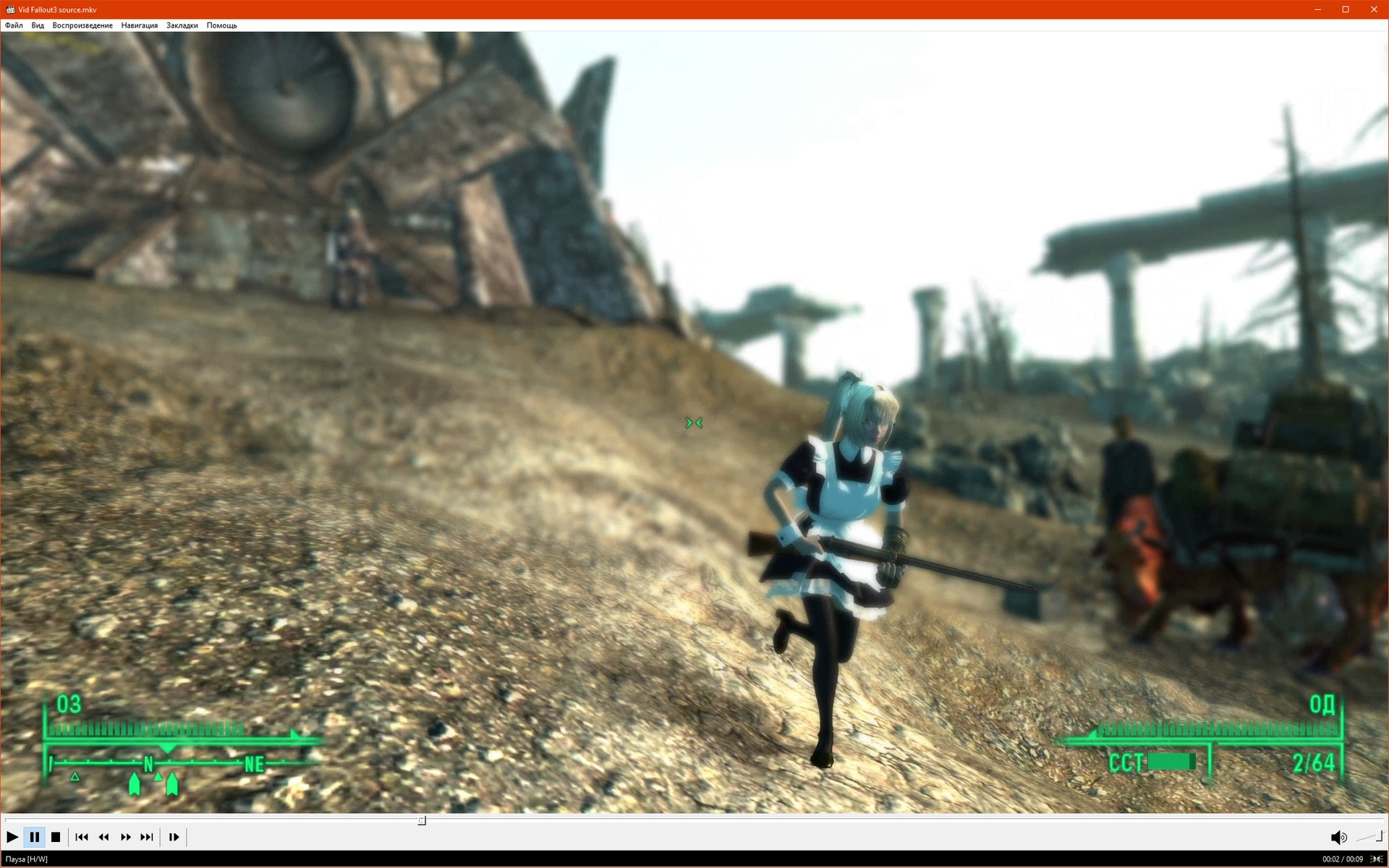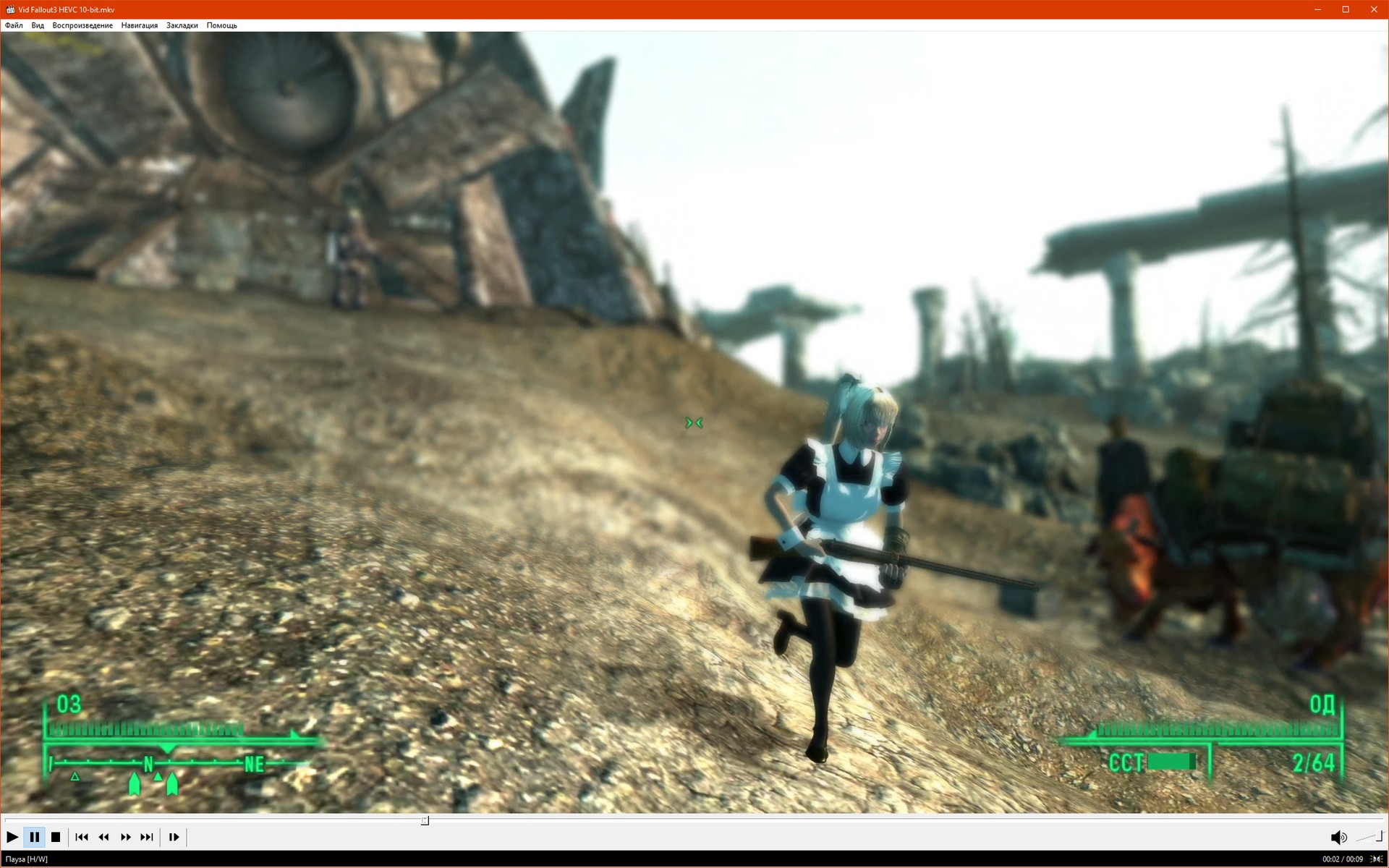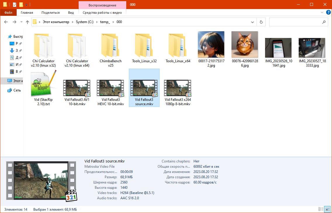 Далее записал короткое видео в разрешении 2560x1440 со скоростью 60 FPS из игры Fallout 3, его конвертировал в формат AV1 (10-bit) и HEVC (10-bit), конечно есть и оригинал в формате x264 (8-bit), и на всякий случай уменьшенная до 1920x1080 версия в формате x264 (8-bit), это поможет проверить насколько хорош стандартный проигрыватель видео "из коробки":