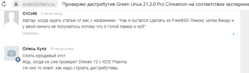 Судя по всему большинство читателей не заинтересованы, чтобы предлагать на проверку конкретные дистрибутивы, скорее всего просто "глаза разбегаются" от зоопарка дистрибутивов, и я могу это понять... Однако один из гиперактивных фанатиков Linux наконец смог из себя выдавить предложение "Debian 12 KDE", а вообще я удивлён как эти комментаторы ещё не захлебнулись в своей же желчи: