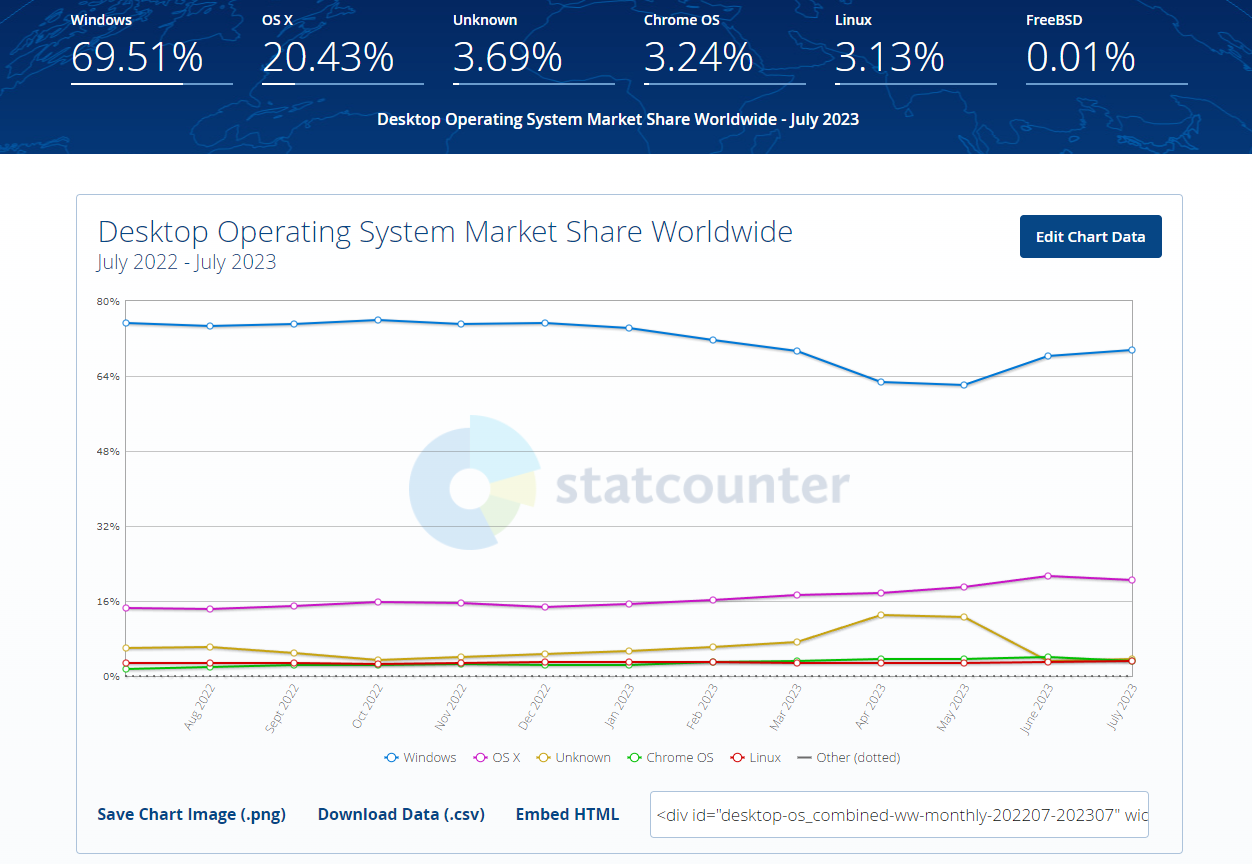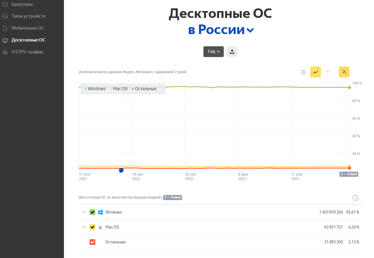 Кстати, по глобальной статистике "линуксы" наконец постучали со дна преодолев отметку в 3%, совсем немного, но это уже прогресс, хотя в российском регионе едва ли за 2% вышли, в общем есть только тотально доминирующая Microsoft Windows и живущая в своей экосистеме Mac OS, увы, "линуксы" как были на дне, так и остались, оно и не удивительно учитывая сколько проблем на ровном месте в дистрибутивах: