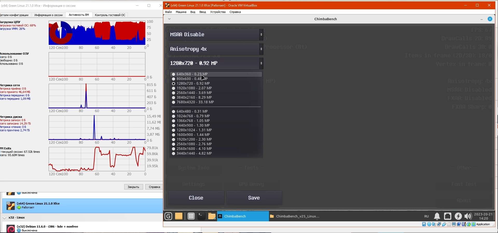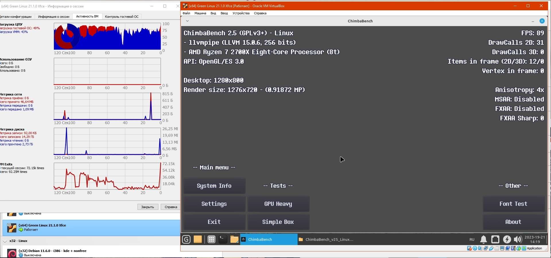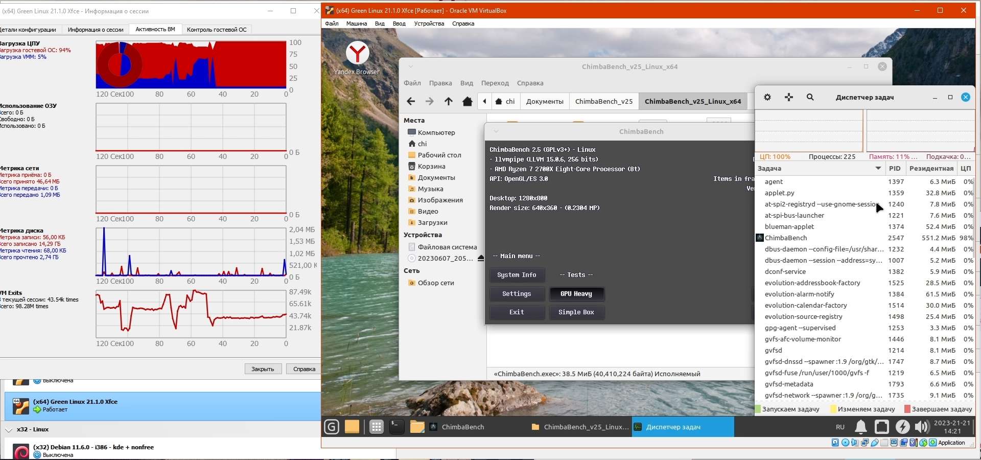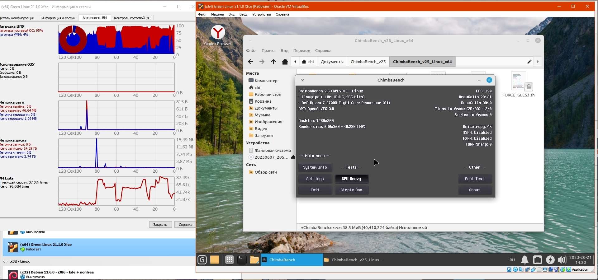 Тест SimpleBox благополучно работает, а вот на тесте GPU Heavy встроенный в дистрибутив драйвер LLVMpipe облажался, пришлось через диспетчер задач закрывать, ибо Green Linux не понимает когда приложение зависло, увы, это не настоящая Windows что сама предложит закрыть явно зависшее приложение...