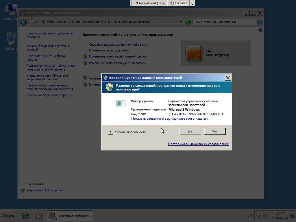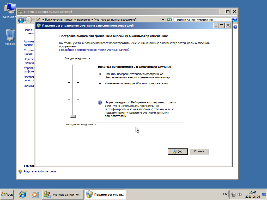 Вот и рабочий стол, сразу же вывожу "файловый менеджер" (проводник) на рабочий стол, а потом смотрю параметры контроля учётной записи, все настроено по умолчанию, чего ещё было ожидать от чистой и нетронутой сборщиками системы: