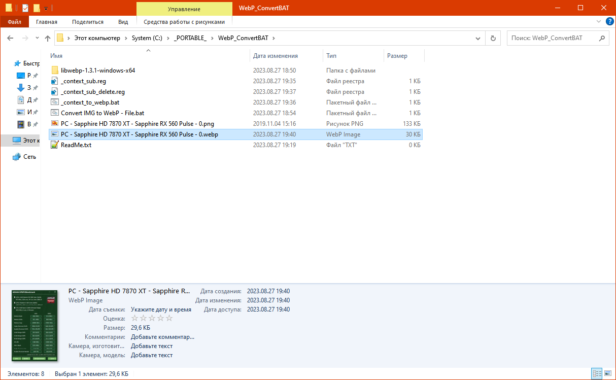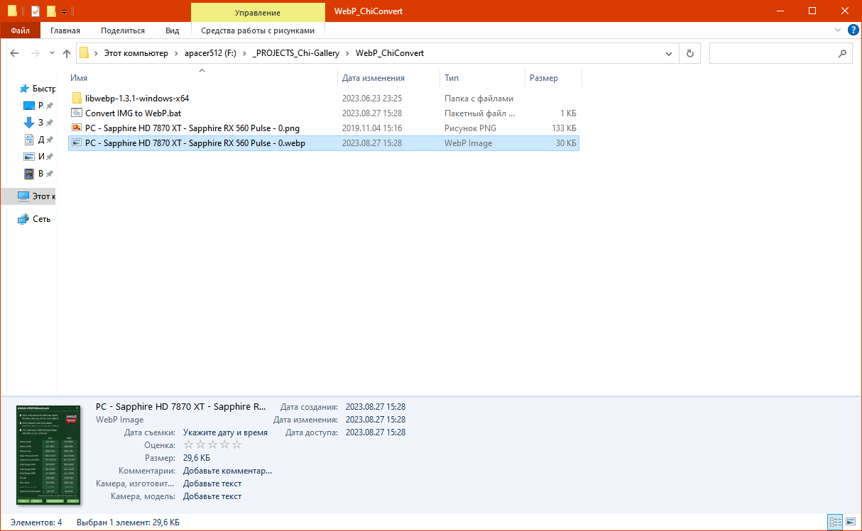 Отлично, теперь можно легко конвертировать изображения, пока этого функционала хватит, потом вероятно доработаю и сделаю полноценную сборку на основе WebP инструментов: